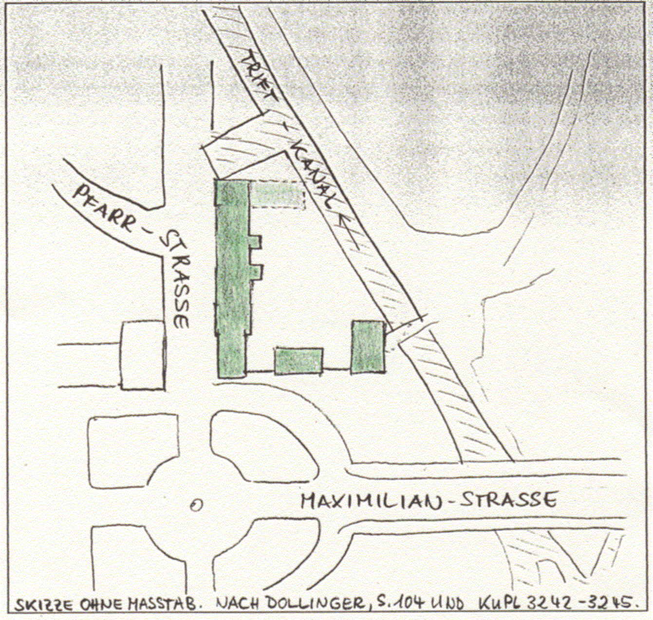 Den Bauplatz bezeichnet Leimbach in diesem Vorbericht als problematisch für die Umsetzung des Bauprogramms, da er gegen Westen von der Pfarrstraße, gegen Osten von einem Triftkanal begrenzt ist und somit ein spitzes Dreieck bildet. Der südliche Abschluß durch die Maximilianstraße erfordere hingegen bei der Fassadengestaltung besondere Aufmerksamkeit: Damit der Gymnasiumsbau gegenüber den dort schon bestehenden Privatbauten nicht zu gedrückt erscheine und zugleich einen "würdigen Abschluß"18) der Straße bilde, sollen dorthin die Räume gelegt werden, die eine größere Höhenentwicklung gestatten.